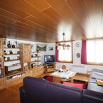 Haupt-Wohnung 5 ½ -Zi. Eingangsbereich mit Garderobe. Bad-WC-Lavabo. Wohnzimmer mit Tulikivi-Speckstein-Holzofen mit Glastür. Wohn-Essküche mit Ausgang zu grosser überdachter Terrasse. Zimmer mit Abstellraum (Notzimmer).