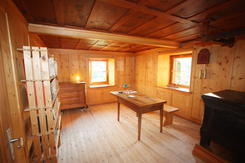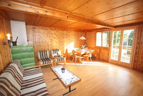 Arvenholz-Wohnzimmer mit Kachelofen und Ausgang zu Terrasse / Garten.